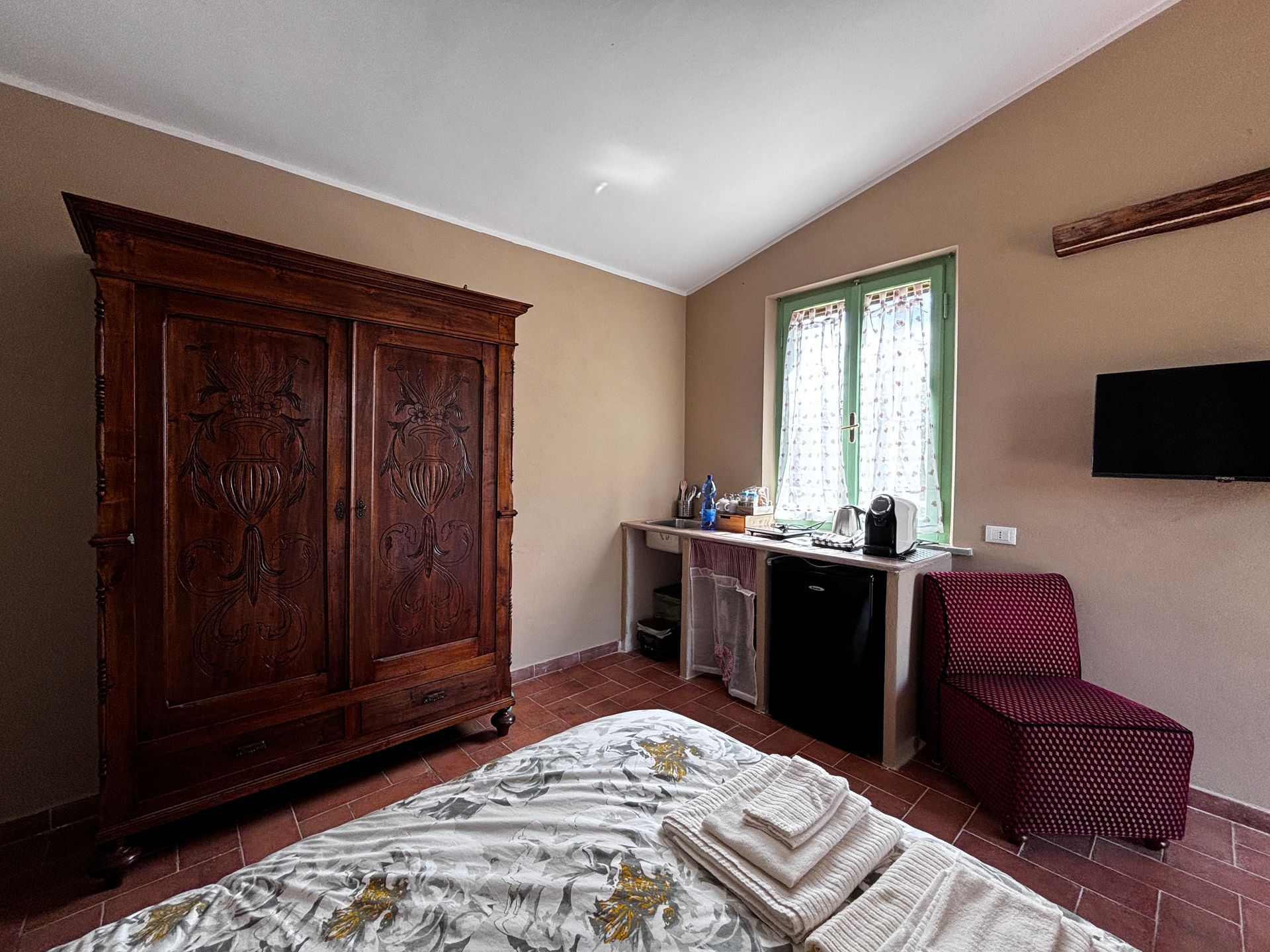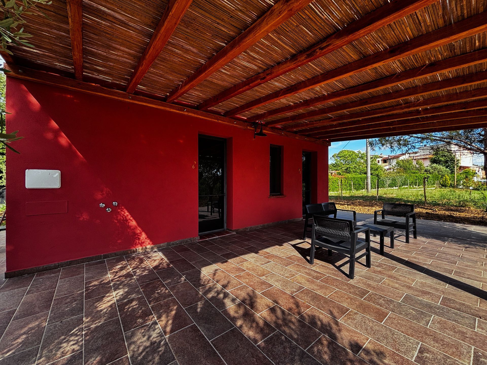- The second building LA CASA ROSSA comprehends 2 independent bedrooms with exclusive 2 bathrooms, La Vigna and Il Pino, with private parking and outside areas. One of the bedroom has a kitchenette with induction stove. Beautiful private veranda, garden and parking.